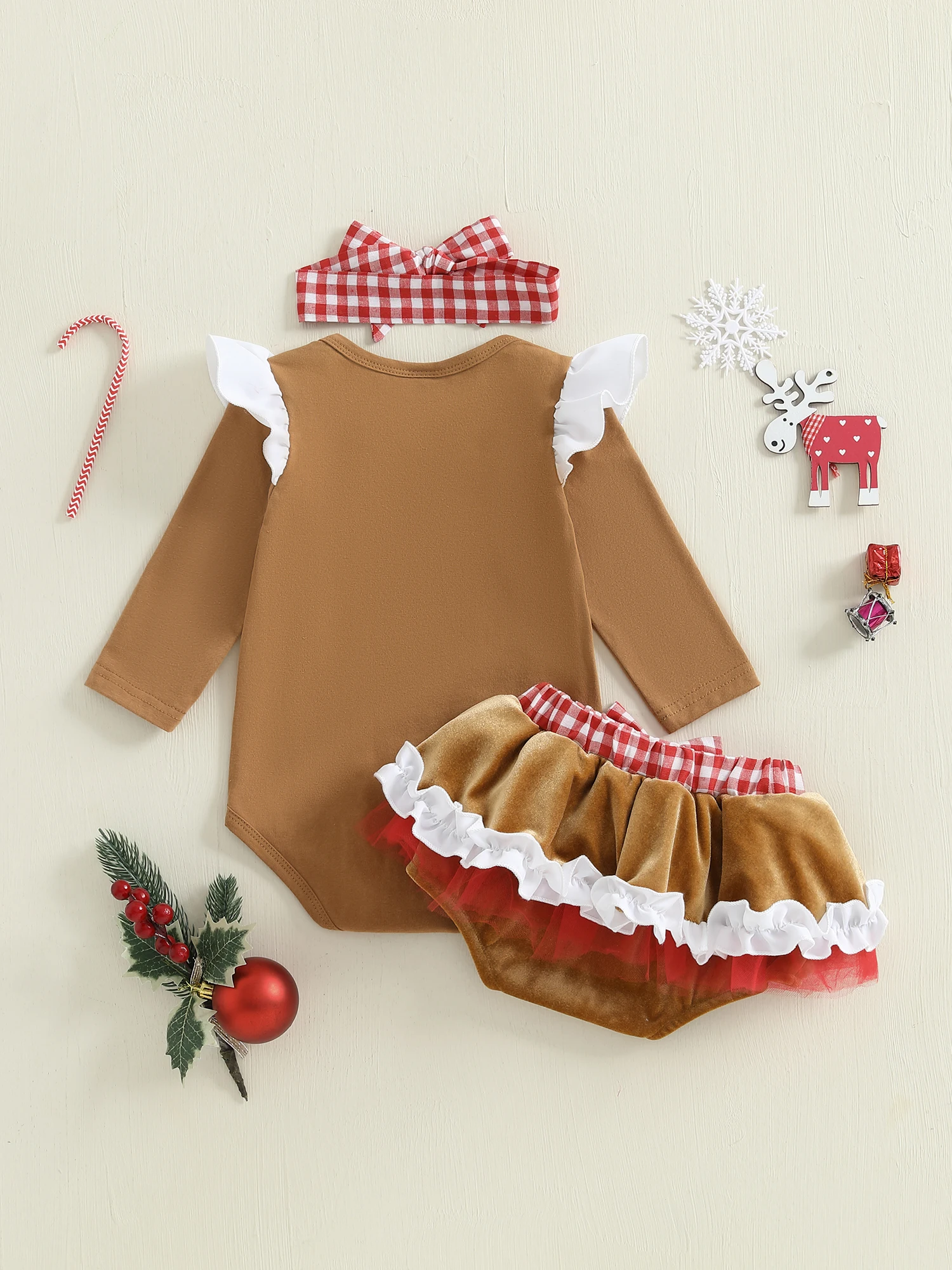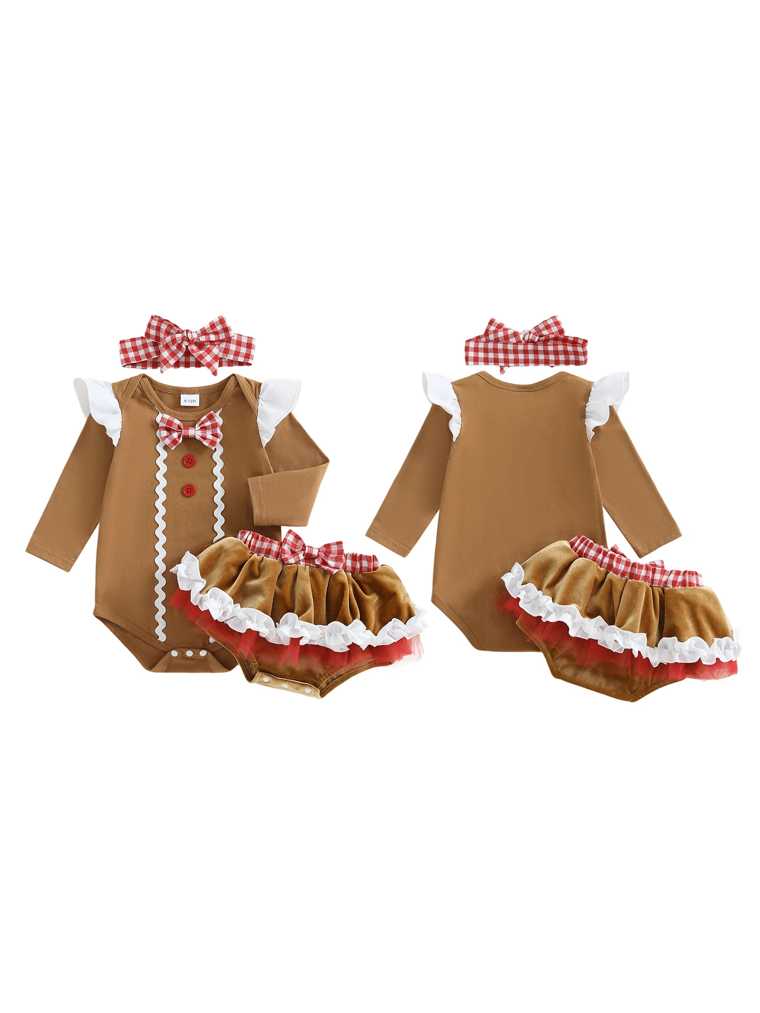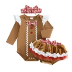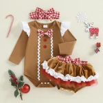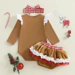 Baby Girl Christmas Outfit Ruffled Trim Decorative Button Short Sleeve Romper Mini Shorts and Bow Headband 3 Pcs Set