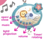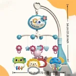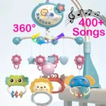 The four detachable hanging cute and cartoon animal toys improve cognition. 360° rotating hanging rattles with music and light to attract the baby’s attention and exercise their vision.