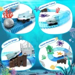 - BLUE OCEAN THEME – Welcome to the underwater world, the ultimate shark race track. Follow in the footsteps of the sharks and see tracks that can change course, go through underwater tunnels, pass over undulating bridges, race out of barrier doors, see sleepless seahorses, explore octopuses, resting starfish, swaying seaweed and more. This toy set is great for family play. Parents can combine the scenes to simulate an underwater adventure for their children.