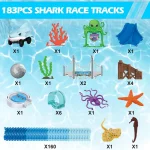 - SHARK TRACK TOY – This shark track toy combines ocean and racing themes for an exciting adventure! The track toy set contains everything you need, including 160 tracks, 1 shark racing car, 1 ball, 1 starfish, 1 yellow croaker, 1 seahorse, 1 octopus, 1 green aquatic plant, 1 red coral, 1 Y-junction track, 1 door, 1 pair of bridges, 4 slopes, 6 tunnels, and 1 360° automatic turntable. Children can use their imaginations to build a wonderful underwater world by connecting the tracks at will.