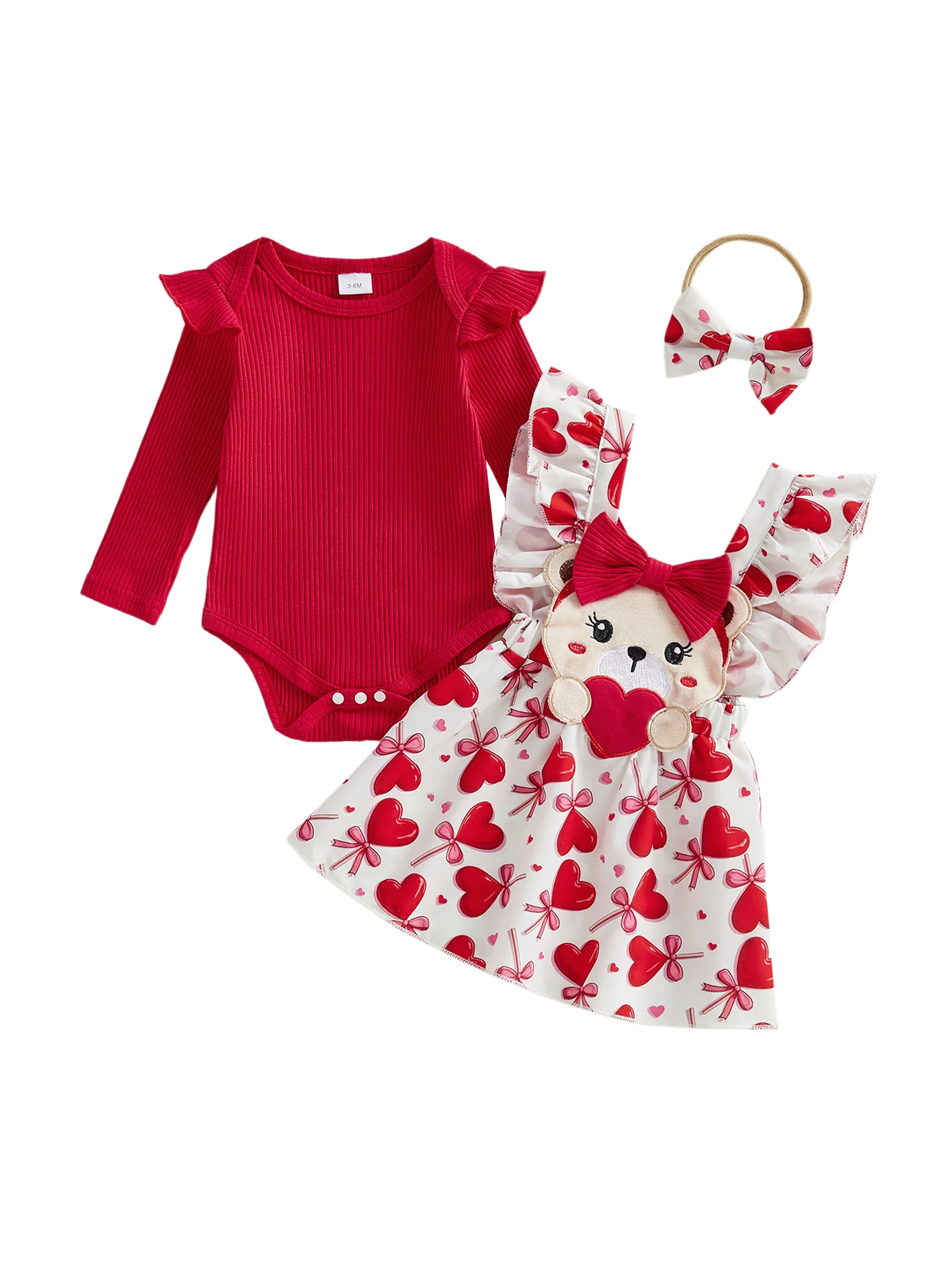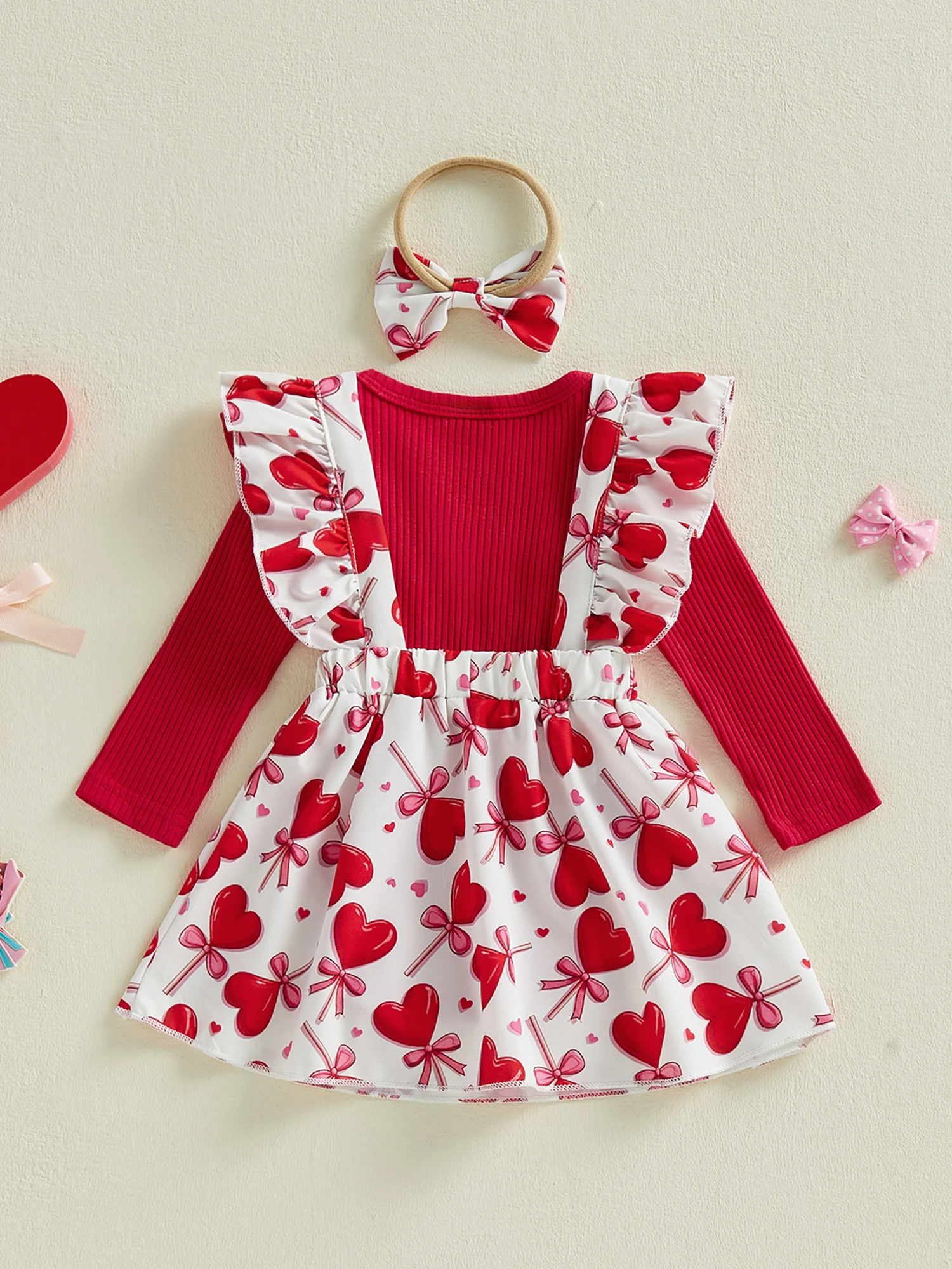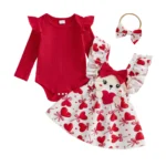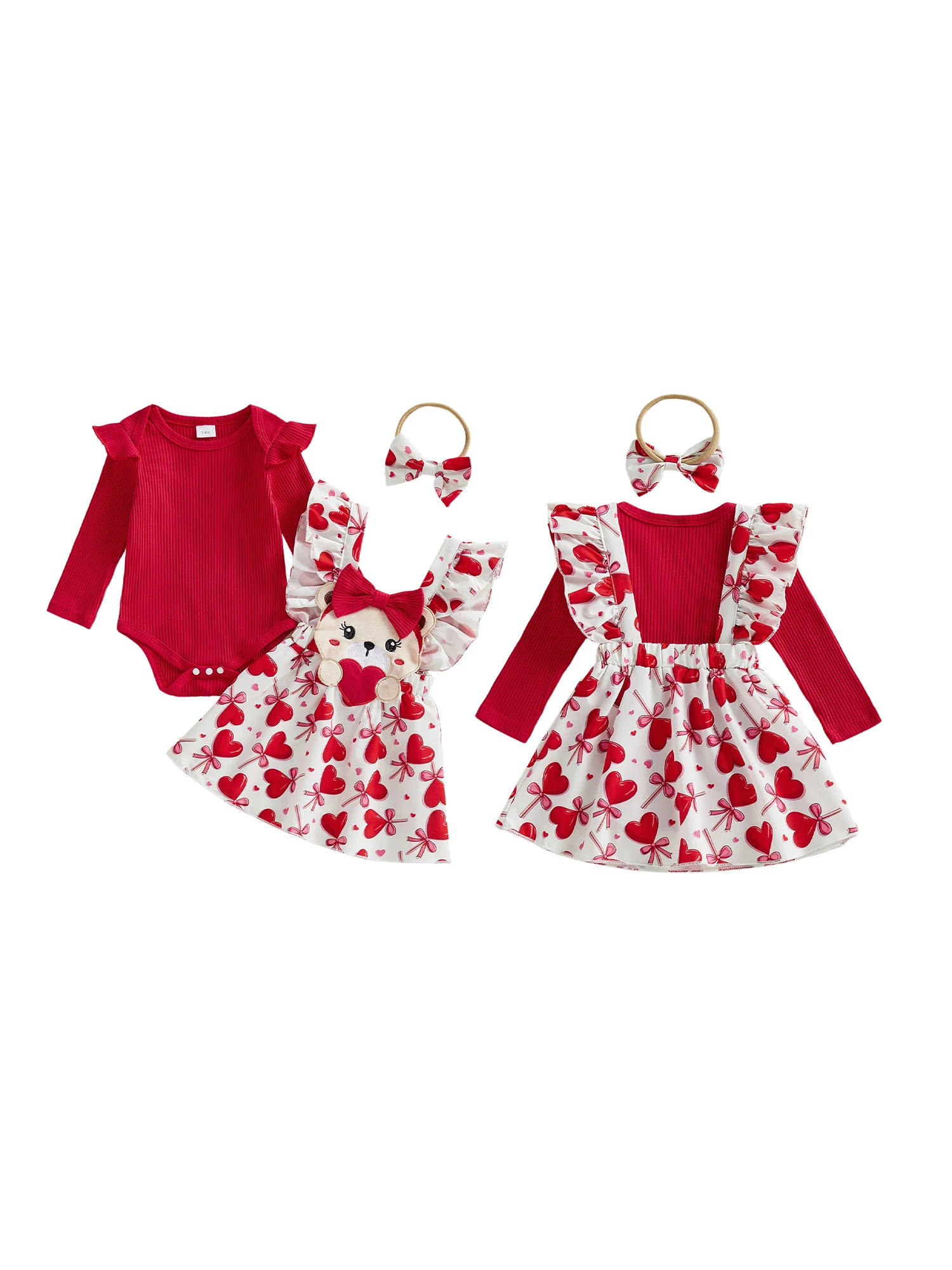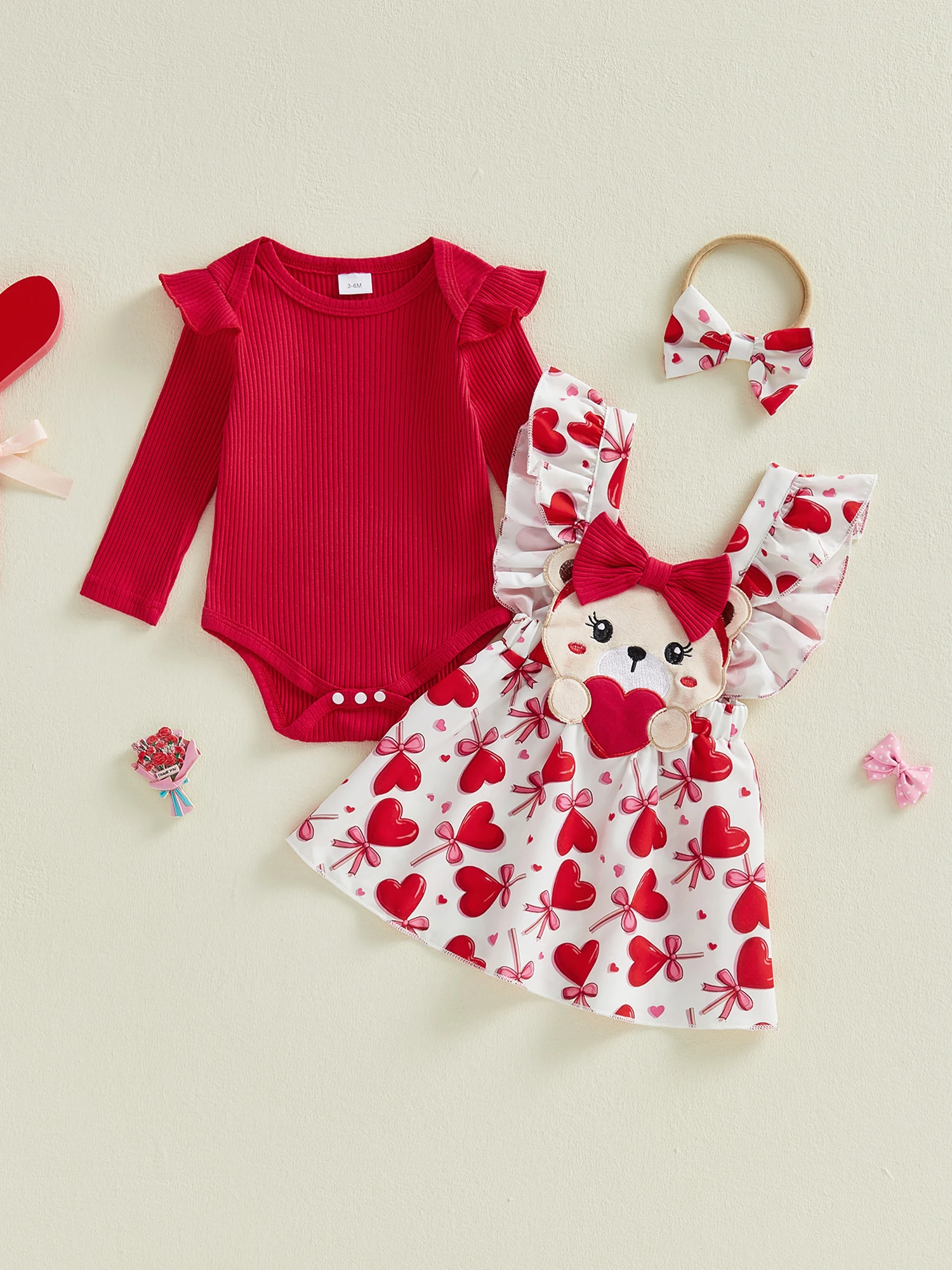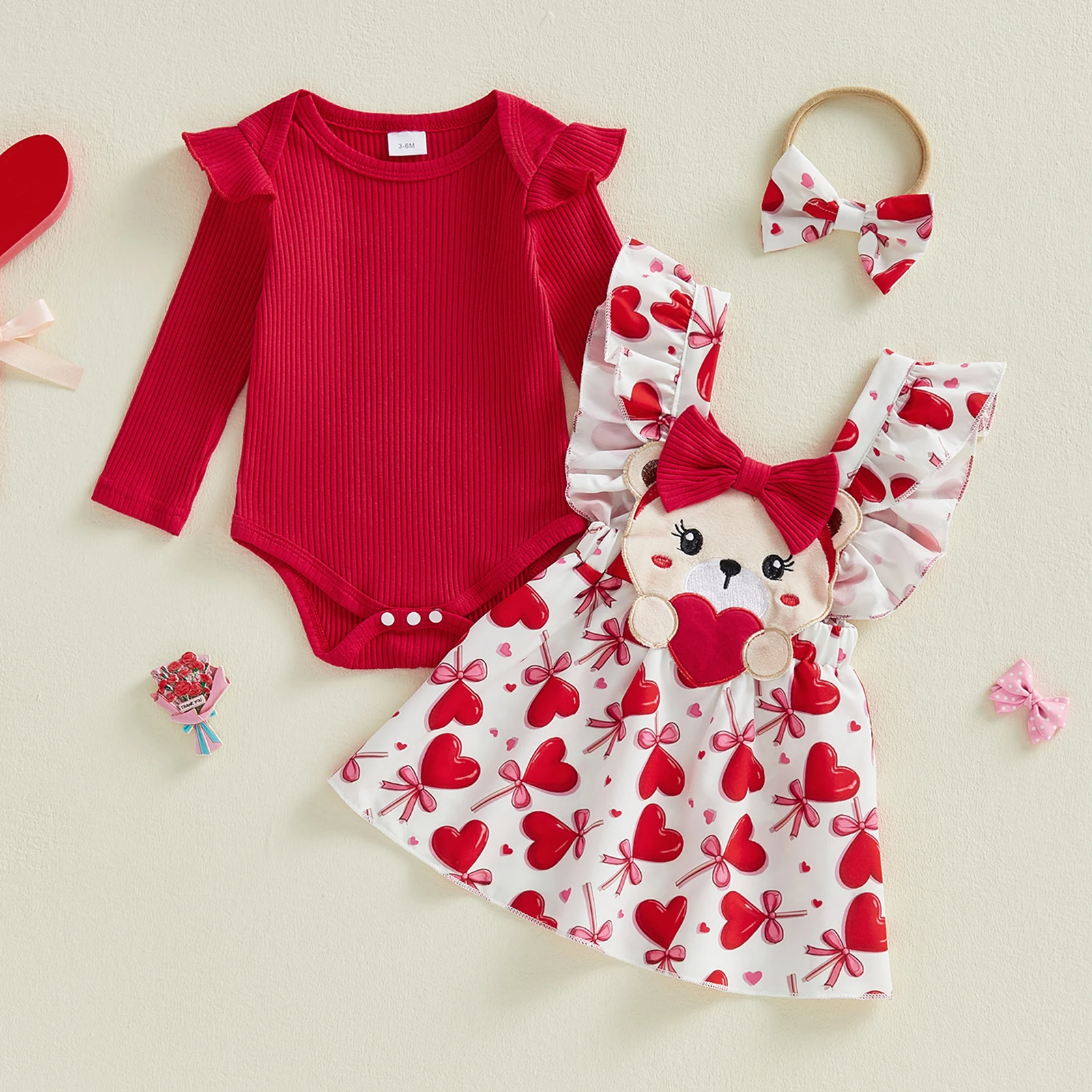 Baby Girl Valentines Day Outfits Solid Ribbed Long Sleeve Romper Heart Candy Print Dress Bow Headband 3 Pcs Set